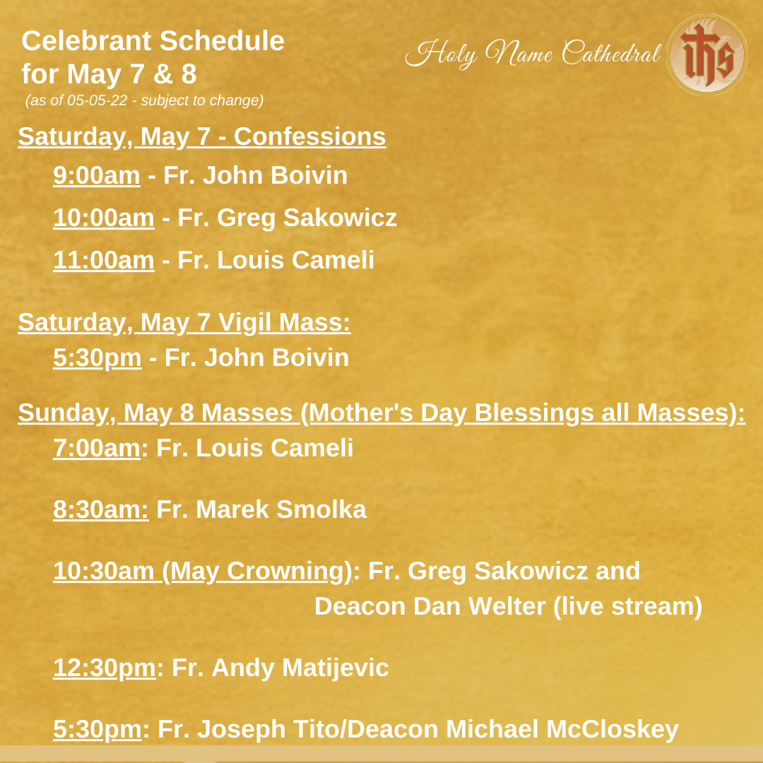 Forgive me Father for I have sinned. Mass Confession Schedule A list of all upcoming Confessions and Liturgies. No Confessions Holy Saturday.